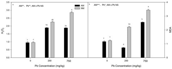 Effect of arbuscular mycorrhizal (AM) fungus inoculation on antioxidant enzyme activities of poplar (Populus simonii × P. nigra ‘1307’) under varying lead (Pb) stress conditions: (a) Hydrogen peroxide (H2O2) levels under different Pb concentrations; (b) Malondialdehyde (MDA) content under different Pb concentrations. Note: Values represent means ± standard deviation (n = 5). NS indicates no significant difference (p > 0.05). Significant effect of two-way ANOVA: * p < 0.05; ** p < 0.01; *** p < 0.001. Pb represents Pb application, AM represents AM fungal treatment, Pb × AM represents the interaction between AM fungal treatment and Pb application. AM: Plants inoculated with arbuscular mycorrhizal fungus (Rhizophagus irregularis); NM: Non-inoculated plants (control group without AMF inoculation). Different letters (a–d) indicate significant differences at p < 0.05. Unit: Pb concentration expressed as mg/kg DW (dry weight); enzyme activity expressed as U/mg protein.