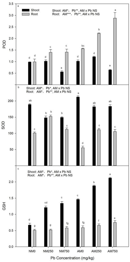 Effect of arbuscular mycorrhizal (AM) fungus inoculation on antioxidant enzyme activities of poplar (Populus simonii × P. nigra ‘1307’) under varying lead (Pb) stress conditions: (a) Peroxidase (POD) activity in shoots and roots under different Pb concentrations; (b) Superoxide dismutase (SOD) activity in shoots and roots under different Pb concentrations; (c) Glutathione (GSH) content in shoots and roots under different Pb concentrations. Note: Values represent means ± standard deviation (n = 5). NS indicates no significant difference (p > 0.05). Significant effect of two-way ANOVA: * p < 0.05, ** p < 0.01, *** p < 0.001. Pb represents Pb application, AM: Plants inoculated with arbuscular mycorrhizal fungus (Rhizophagus irregularis); NM: Non-inoculated plants (control group without AMF inoculation). Different letters (a–g) indicate significant differences at p < 0.05. Different letters (a, b, c) indicate significant differences at p < 0.05. Unit: Pb concentration expressed as mg/kg DW (dry weight); enzyme activity expressed as U/mg protein.