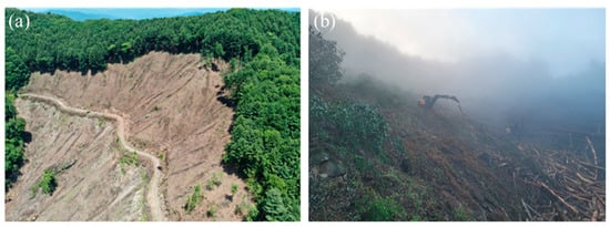 (a) Panorama view of study site in timber harvesting area and (b) wood-grab-equipped excavator during wood throwing.