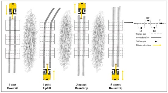 The research site was located in the timber harvesting area, and wood felling using a chainsaw ended on 9 June 2023. An excavator (HX 65 AMT, Hyundai®, Seoul, Republic of Korea) was used in wood throwing, which is the operation of throwing wood for timber transportation and loading. The tire of the excavator was a crawler type, and the weight of the excavator without load was 6.39 tons. The area where a single tire of the excavator directly pressed on the soil surface was approximately 380 mm wide and 1990 mm long. While driving in the harvesting area, the excavator threw the wood in the direction of the forest road located below the slope and organized it on the slope to prevent residues from being swept down (Figure 1b). During wood throwing, the excavator trail is not pre-designed and fluidly depends on the operator’s subjectivity, and it does not pass only once on each trail. In this study, four treatments were imposed on the machine trail, where the experimental variables were a traffic frequency of 1, 3, and 5 excavator passes in the harvesting area (Figure 2). In addition, treatments with one pass were classified according to the direction of driving (uphill or downhill) (Figure 2). Plots were replicated three times, so a total of 12 plots were selected (Figure 2). In a selected plot, three survey lines were divided to assess the impacts of excavator traffic on soil during wood drawing (Figure 2). However, we excluded two survey lines because they experienced rapid soil disturbance due to a change in excavator direction during a single downhill drive (Figure 2).