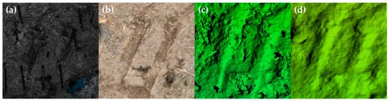 Acquisition data using MLS and data processing to apply the SfM algorithm. Examples of zoomed-in views of (a) point cloud data obtained from MLS and (b) point cloud data (PCD) generated using SfM on wheel tracks. The digital elevation model (DEM) generated using (c) PCD of MLS and (d) PCD of SfM for the same location of PCD.