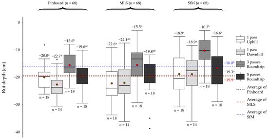 Rut formation by forestry machine driving conditions (intensity and direction of driving) for each measurement method (MLS and SfM). Red points indicate average values and bold black horizontal lines within each boxplot indicate median values. Different letters represent significant differences in soil rut depth among machine driving conditions and measurement methods, respectively, at p < 0.05.