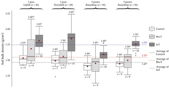 Soil bulk density (BD) by forestry machine driving conditions and positions. Red points indicate average values, and bold black horizontal lines within each boxplot indicate median values. Different letters with top of each box represent significant difference in BD among position in each machine track at p < 0.05.