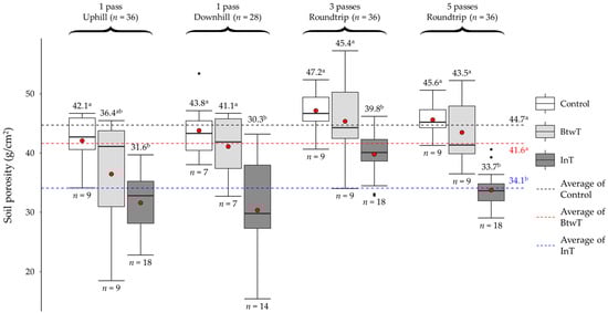 Soil porosity (SP) by forestry machine driving conditions and positions. Red points indicate average values, and bold black horizontal lines within each boxplot indicate median values. Different letters indicate significant differences in SP among position in each machine track at p < 0.05.
