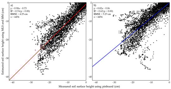 The accuracy of soil surface estimation was higher for the MLS-based data than for the SfM-based data, with an average of 7.75 mm pixel−1 for MLS and 2.33 cm pixel−1 for SfM. Using MLS, SfM, and a pinboard, a total of 68 profile lines were generated, from which 4494 soil surface height data points were acquired for each method. To validate the MLS- and SfM-based data, linear models were fitted to the soil surface height data, which were obtained using the pinboard. When comparing the surface estimates made using MLS with the pinboard data, the R2 value was 0.74 and the slope of the linear model was 0.98 (p = 0.00, Figure 8). It was difficult to hold and move the MLS on steep slopes when detecting the soil surface with the MLS. This may have affected the R2 value of the MLS. The R2 value between the SfM-based data and the pinboard data were 0.65 and the slope of the linear model was 0.82 (p = 0.00, Figure 8). However, the SfM-based data appeared to be at a disadvantage due to blurring and distortions in detecting complex and irregular terrains [80,81,82].