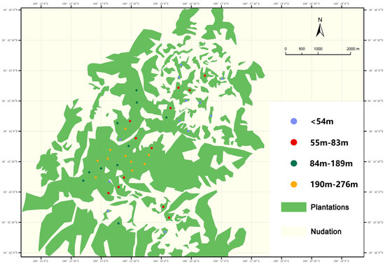Map of study sites. Purple dots represent 12 sample plots located within 54 m of the edge, red dots represent 12 sample plots located at 55–83 m from the edge, dark green dots represent 10 sample plots located at 84–189 m, and orange dots represent 10 sample plots located at 190–276 m. light green blocks represent planted forests and yellow blocks represent bare land.