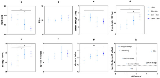 Multiple comparisons of each index chart and T test volcano plots. * represents a significant difference, ** represents a more significant difference and *** represents a most significant difference. (a–g) represent DBH, tree height (H), carbon storage, tree density, canopy cover, species richness, and Shannon index, respectively. The multiple comparisons of each index are shown in the chart, and the T-test volcano plots are presented for statistical analysis. (h) refers to multiple unpaired t-tests conducted for these comparisons. The horizontal dashed line of (h) represents the significance line, above which a significant difference is represented by the t-test and the vertical dashed line distinguishes between positive and negative values of the difference.