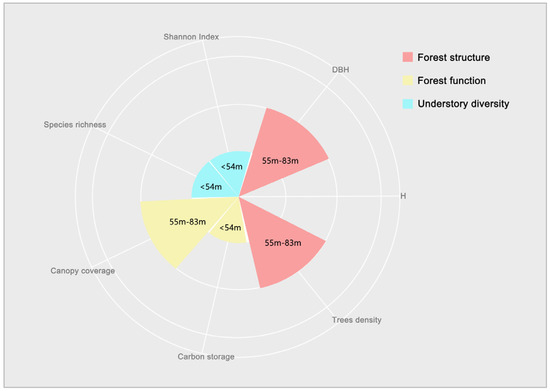 Carbon storage, species diversity, and the Shannon index were assessed at distances of <54 m from the edge. In contrast, diameter at breast height (DBH), tree density, and canopy cover were evaluated at distances ranging from 0 to 83 m from the edge (Figure 3 and Figure 4).
