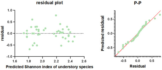 The multiple linear regression analysis revealed that the distance from the edge and canopy cover did not exhibit a significant correlation with the understory Shannon index. However, stand density showed a significant positive effect on the understory Shannon index (Table 1, R2 = 0.34, p = 0.03) (Figure 5).