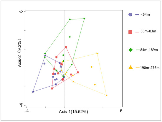 CCA species ranking diagram. Purple circle represents < 54 m, red square represents 55–83 m, green prism represents 84–189 m, and yellow triangle represents 190–276 m. Points farther away represents the greater difference in species composition.