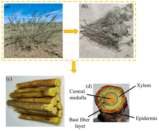 Growth status of Caragana korshinskii Kom. branches and samples: (a) Caragana korshinskii Kom. growth status; (b) samples collected; (c) truncated specimen; (d) end surface after drying.