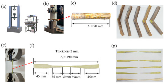 Equipment and specimens for shear and tensile mechanical testing of Caragana korshinskii Kom. branches: (a) electronic universal testing machine; (b) shear test; (c) shear specimen; (d) condition of the specimen after shearing; (e) tensile test; (f) tensile specimen; (g) condition of the specimen after fracture.