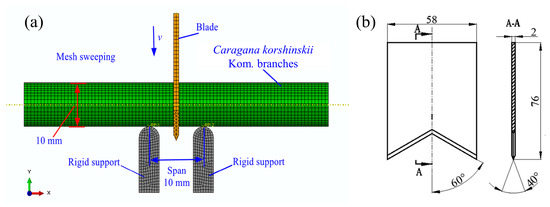 Finite element cutting model and mesh division of Caragana korshinskii Kom. branches: (a) three-dimensional model; (b) shear blade.