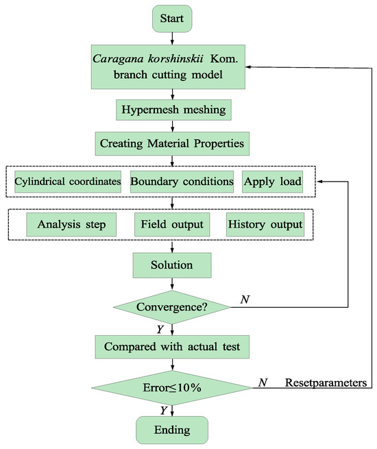 The Caragana korshinskii Kom. branches are left unconstrained, while displacement in the Y direction is applied to the blade model at a constant speed of 10 mm·min−1. The support base is modeled as a rigid body and fixed in place. For contact, “penalty” contact is applied between the Caragana korshinskii Kom. branches and the blade model, with the distance minimized to reduce idle computation time prior to cutting. Essentially, the numerical analysis of the Caragana korshinskii Kom. branches cutting process involves studying the large deformation and eventual failure of the stem unit under overload, with the observable result being branch fracture. To streamline the modeling process, the branch is treated as a single entity, and the Johnson–Cook model is used to define its material properties. The model construction workflow is displayed in Figure 4.
