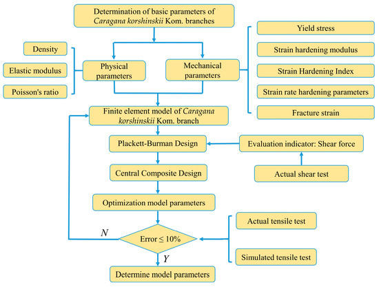 This study focuses on developing a finite element model for Caragana korshinskii Kom. branches and calibrating the necessary parameters. Using Caragana korshinskii Kom. branches in full bloom as the subject, we established a finite element model with ABAQUS and analyzed the relationship between the shear force and displacement. The Johnson–Cook model was employed to create a finite element shear model for Caragana korshinskii Kom. branches and to calibrate its parameters. Plackett–Burman and climbing tests were conducted to identify key parameters influencing the shear mechanical model of Caragana korshinskii Kom. branches, specifically the yield stress and strain. This included the strengthening index and fracture strain. Through central composite design experiments, the optimal parameters for the shear model of Caragana korshinskii Kom. branches were identified: a yield stress of 18.65 MPa, a strain strengthening index of 0.59, and a fracture strain of 0.54. The results indicated that the maximum error in the simulated shear force values for Caragana korshinskii Kom. branches of varying diameters was 9.68%. Additionally, the difference between the simulated and actual tensile force values was 1.7%. These findings indicate that the calibrated finite element model is accurate and effective in simulating the failure behavior of Caragana korshinskii Kom. branches, providing a valuable tool for optimizing cutting and harvesting processes.