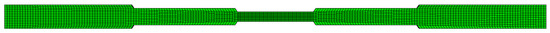 The primary forms of material damage during the crushing of Caragana korshinskii Kom. branches are shear failure and tensile failure. To accurately model the Caragana korshinskii Kom. branches, a tensile test was conducted corresponding to the constructed model. A tensile specimen model matching the actual specimen size was created. To enhance simulation speed and simplify testing equipment, the stem contact areas were disregarded; one end of the specimen was fixed while tensile force was applied to the other end. The loading speed and conditions mirrored those of the actual test. The tensile simulation model of Caragana korshinskii Kom. branches is illustrated in Figure 6. The specimen was meshed using C3D8R elements, which are 8-node hexahedral elements featuring simplified integration. The load was applied as a displacement at a rate of 10 mm·min−1, with material properties based on values obtained from the shear test.