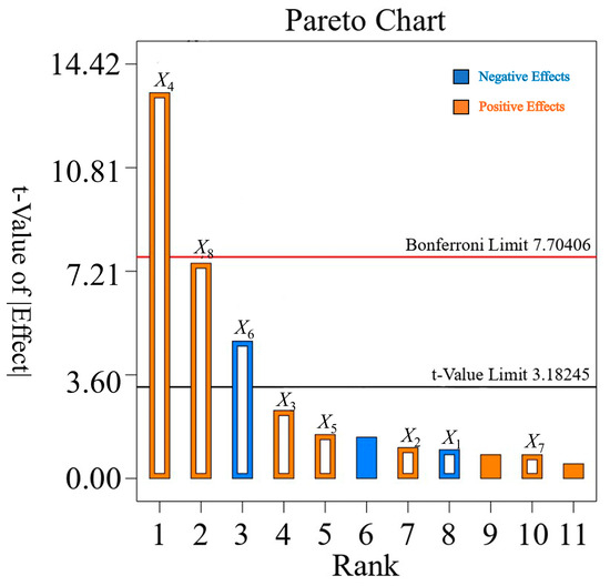 The Plackett–Burman test was conducted using Design-Expert software (version 12.0.4.x64) to identify parameters significantly affecting the maximum shear force. Factors included in the test were density, elastic modulus, Poisson’s ratio, yield stress, strain hardening modulus, strain hardening exponent, strain rate hardening parameter, fracture strain, and failure displacement. Research on the mechanical and physical properties of Caragana korshinskii Kom. branches remains incomplete, particularly regarding finite element model parameters. The values or ranges for each test parameter were established based on prior results and referenced from various stem parameters [31]. The test parameters are presented in Table 1.