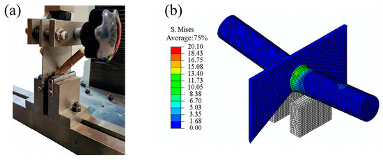 A three-dimensional model of cutting Caragana korshinskii Kom. branches with a diameter of 10 mm was created using SOLIDWORKS 2022 and imported into ABAQUS 2022 for further analysis. Initially, the contact between the shear blade and Caragana korshinskii Kom. was defined using the contact pair algorithm. The shear blade was designated as the master surface, while the Caragana korshinskii Kom. surface was treated as the slave surface. Given that the Caragana korshinskii Kom. model experiences significant shear deformation during the cutting process, the contact pair was assigned a small slip formulation. This setting allows minimal relative sliding between the shear blade and the Caragana korshinskii Kom. surface throughout the analysis. The normal contact behavior between the master and slave surfaces was modeled as “hard” contact, while the tangential behavior was modeled using the Coulomb friction model with the “penalty” method. This approach permits some relative movement (“elastic sliding”) when the surfaces are in contact. The friction coefficient between the shear blade and Caragana korshinskii Kom. was set to 0.36. The support was modeled as a rigid body, with the shear loading speed along the Y-axis set to 10 mm·min−1 and the total simulation time set to 12 s. During mesh generation, an appropriate mesh structure and size were chosen to balance simulation accuracy and computational efficiency. Given the tool’s irregular shape, the blade was meshed with tetrahedral elements (C3D10M). The remaining components, including the support and Caragana korshinskii Kom. branch, were meshed using hexahedral structured elements (C3D8R). The mesh size was set to 1 mm, resulting in a total of 32,493 elements. Figure 3a shows the three-dimensional model, while Figure 3b presents a two-dimensional diagram of the shear blade.