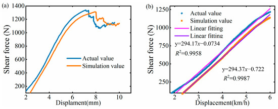 Figure 10a presents the shear force–displacement curve of the Caragana korshinskii Kom. branches, showing a consistent trend, with peak shear forces of 1333.24 N and 1285.63 N, indicating a small difference between them. Figure 10b displays the fitting curve of the force–displacement changes in the elastic stage of the stem. The slopes of the fitting curves for the actual and simulated values were 294.17 and 297.37, respectively. The fluctuations in the actual value curve can be attributed to the heterogeneity and complexity of the shear specimens.