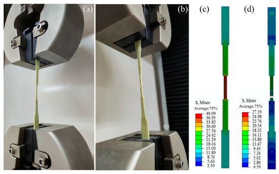 Tensile test comparison: (a) actual stretching stage; (b) sample fracture; (c) simulation stretching stage; (d) simulated sample fracture.