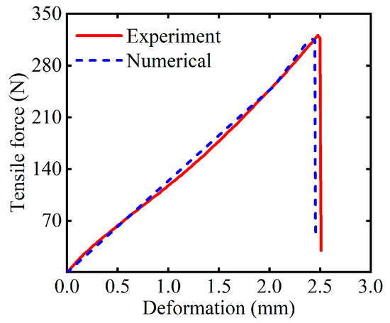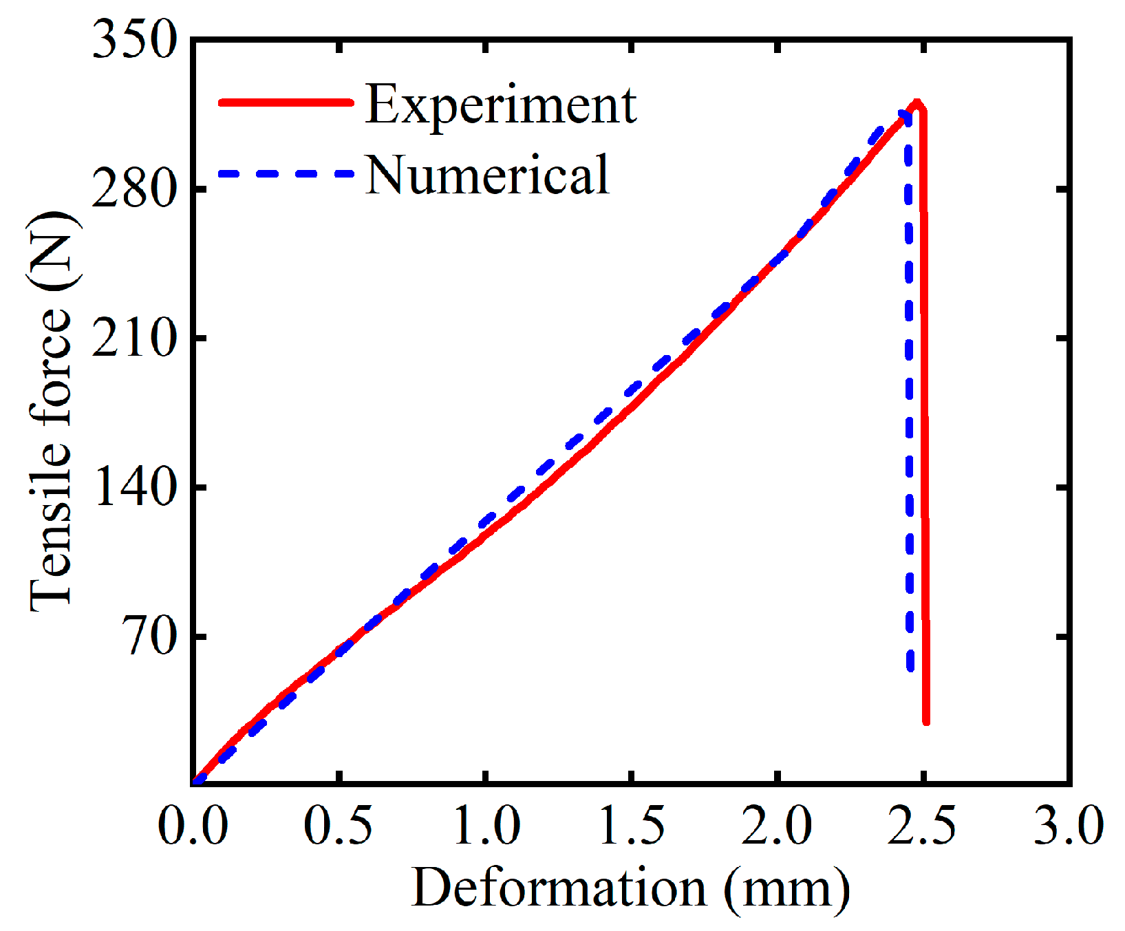 Figure 12 illustrates the load–displacement curve of the specimen, showing a strong alignment between the predicted and experimental curves. The predicted maximum load capacity was Fm = 315.66 N at a displacement of 2.47 mm, which was slightly below the test value of Fm = 321.01 N, resulting in a relative error of 1.7%.