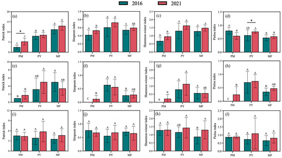 With the growth of restoration years, the Patrick index and Shannon–Wiener index of PM showed an increased trend in the tree layer, shrub layer, and herb layer. The Simpson index of PM increased in the tree and herb layers and decreased in the shrub layer. The Pielou index of PM increased in the shrub layer and herb layer, while decreasing in the tree layer. The Patrick index, Shannon–Wiener index, and Pielou index of PY increased in the tree layer, shrub layer, and herb layer. Among them, the Pielou index of the tree layer of PY increased significantly (p < 0.05). The Simpson index of PY increased in the tree and herb layers and decreased in the shrub layer. The Simpson index, Shannon–Wiener index, and Pielou index of MF showed an increased trend in the tree layer, shrub layer, and herb layer. The Patrick index of MF increased in the tree and herb layers and decreased in the shrub layer. In the tree layer (Figure 1a,b), with the increase of vegetation restoration time, the Patrick index showed MF > PY > PM. The Simpson index and Shannon–Wiener index showed PY > MF > PM. However, the Pielou index changed from the highest for PM in 2016 to the highest for PY in 2021. In the shrub layer (Figure 1e–h), the Patrick index changed from the highest for MF in 2016 to the highest for PY in 2021. The Simpson index, Shannon–Wiener index, and Pielou index still showed PY > MF > PM during the five years of vegetation restoration. In the herb layer (Figure 1i–l), there were no significant difference in species diversity index among the three forests.