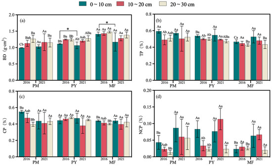 With the increase of vegetation restoration years, the BD of MF decreased in the 0–10 cm, 10–20 cm, and 20–30 cm soil layers, and decreased significantly in the 0–10 cm soil layer (p < 0.05). The BD of PY decreased significantly in the 0–10 cm soil layer (p < 0.05). The BD of PM decreased in the 20–30 cm soil layer, but it was not significant. The TP of the three forests was the highest in the 0–10 cm soil layer (Figure 2b). The TP of MF increased by 13.03% and 7.72% in 0–10 cm and 10–20 cm soil layers, respectively. In 2016, the TP of the three forests showed PM > PY > MF in the 0–10 cm soil layer. By 2021, PY and MF gradually increased, reaching the same level of PM. In the 2016–2021 vegetation restoration stage, the CP of PM decreased in the 0–10 cm and 10–20 cm soil layers, while it increased in the 20–30 cm soil layer (Figure 2c). There was no significant difference in MF. By 2021, the NCP of PM increased between 219.48% and 617.05% in the 0–30 cm soil layer (Figure 2d). The NCP of PY increased by 213.31% in 10–20 cm soil layer. MF increased by 256.95% and 172.01% in 0–10 cm and 10–20 cm soil layers, respectively.
