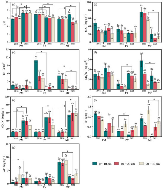 Soil chemical properties of different recovery years in different soil layers. Note: PM: Pinus massoniana forest; PY: Pinus yunnanensis forest; MF: mixed forest of Pinus yunnanensis and Quercus variabilis. (a) pH: potential of hydrogen; (b) SOC: soil organic carbon; (c) TN: total nitrogen; (d) NH4+-N: ammonium nitrogen; (e) NO3−-N: nitrate nitrogen; (f) TP: total phosphorus; (g) AP: available phosphorus. Capital letters indicate the significance of different forest types in the same year and soil layers (p < 0.05); small letters indicate the significance of different soil layers in the same year and forest types (p < 0.05); * indicates the significance of the same forest types and soil layers in different years (p < 0.05).
