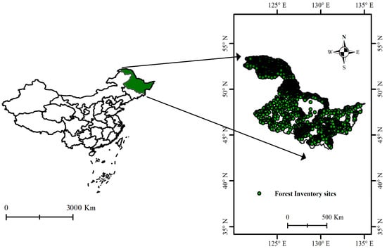 The dataset comprised 3074 sites from the 9th National Forest Resources Inventory (2015) (Figure 1). For each site, the data included details on the individual trees (e.g., DBH, height, and species), site location, site area (0.06 ha), forest type, age group, forest health, and management practices. Using individual tree data and a compatible biomass model for the key tree species in the Heilongjiang Province [12], biomass was estimated for each tree and categorized into four components: leaf, branch, stem, and root. Site biomass, the sum of all trees’ biomass, was converted to carbon density (t/ha) using a conversion coefficient of 0.47 [13].