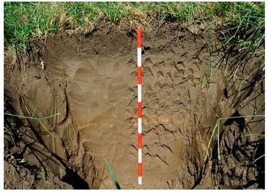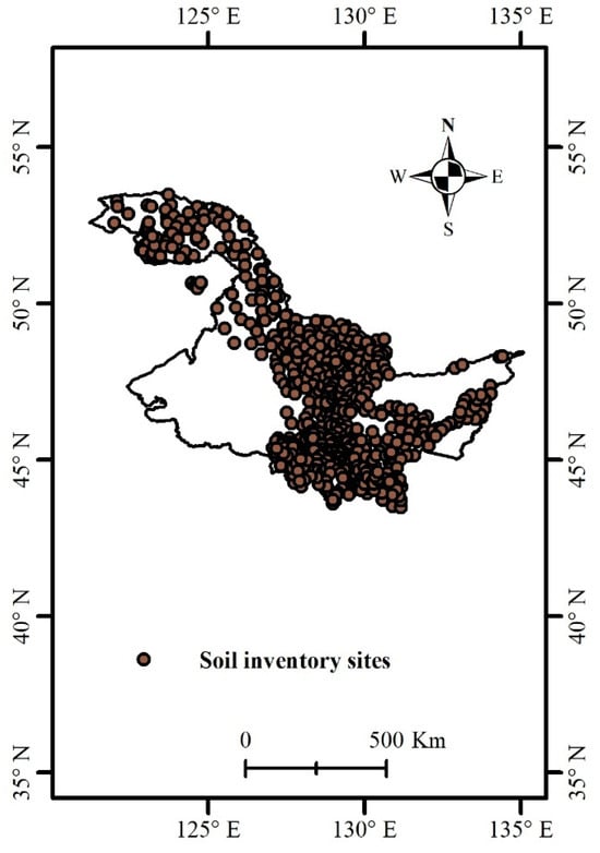 Additionally, samples from 569 soil carbon density sites were collected from 2012 to 2015 in Heilongjiang Province (Figure 2). Each site, measuring 30 m × 30 m, included three soil profiles with a depth of 1 m (Figure 3). Site locations were selected to represent a range of forest types, topographical features, and elevations (100 m to 1000 m), encompassing 12 primary forest types and various slope positions and directions. The soil carbon density (t/ha) for each site represents the average soil organic carbon content at 1 m depth across the three profiles.