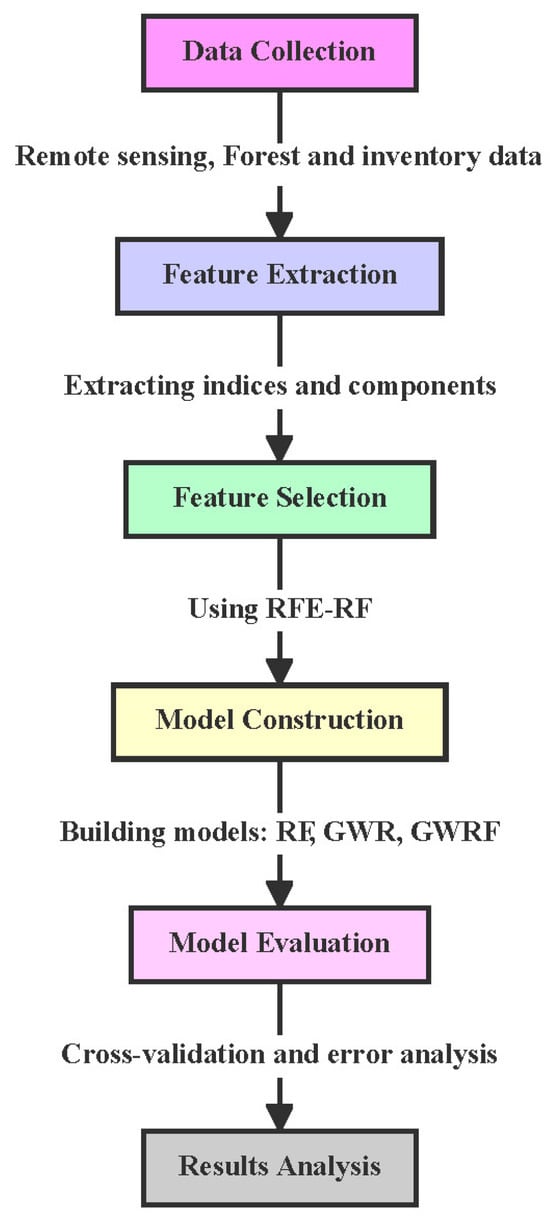 The technical process of this study involved several key steps (Figure 4): First, features were extracted from the Landsat 8 OLI data, including vegetation indices and texture information. Following this, recursive feature elimination with RF was used to select the most important features for model prediction. The models for estimating forest vegetation and soil carbon storage were then constructed using RF, GWR, and GWRF. Finally, the models were evaluated through cross-validation and error analysis, leading to comprehensive results analysis.