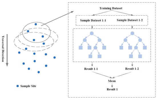 The GWRF model was initially introduced by Santos et al. [19] and later advanced by Georganos et al. [8], who integrated GWR with RF to fully realize the GWRF framework. This model builds upon the GWR concept while extending the global RF model, accommodating both spatial heterogeneity and nonlinear effects as well as interactions among variables. As a local model, GWRF considers nonlinear influences, variable interactions, and spatial autocorrelation, thereby mitigating the impact of spatial heterogeneity on the results. The GWRF model processes multivariate vector information to train RF by computing the local RF for each position, i.e., by applying distance-based weights to establish varying probabilities within the RF ensemble and modeling the spatial relationships among nearby observations. It incorporates the spatial position information of different features and synthesizes predictions from all decision trees through voting or averaging (Figure 5).