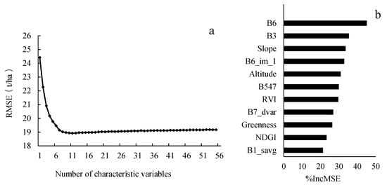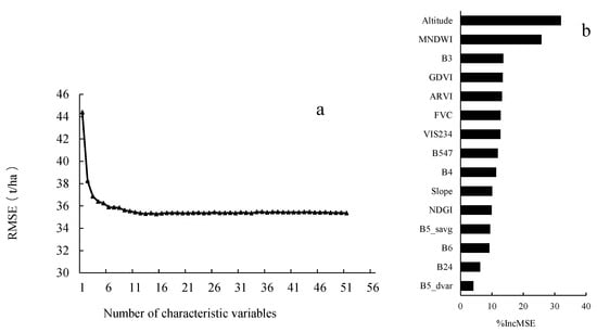 To balance accuracy and efficiency in the FVC estimation model, RMSE was utilized to identify the optimal number of variables, thus mitigating the risk of overfitting. As depicted in Figure 6a, the RMSE started to stabilize after the number of variables exceeded 11. Additionally, the %IncMSE values were used to assess and rank the importance of each variable in relation to forest vegetation carbon storage. Consequently, the top 11 variables with the highest %IncMSE values were selected for constructing the FVC estimation model, as illustrated in Figure 6b.
