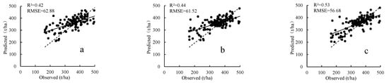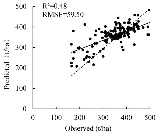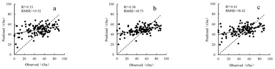 Comparative analysis of the models’ accuracy revealed that the GWRF model achieved the highest R2 (0.41) and the lowest RMSE (18.42 t/ha), rRMSE% (47.99), and MAE (14.93 t/ha). Conversely, the GWR model exhibited the lowest R2 (0.33) and the highest RMSE (19.52 t/ha), rRMSE% (50.87), and MAE (16.19 t/ha). Overall, the model accuracy ranked as follows: GWRF > RF > GWR. Detailed accuracy evaluation results are presented in Table 1 and Figure 7.
