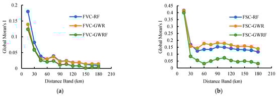 Changes in residual spatial autocorrelation coefficients for GWR, RF, and GWRF with increasing distance band. (a) FVC estimation; (b) FSC estimation.