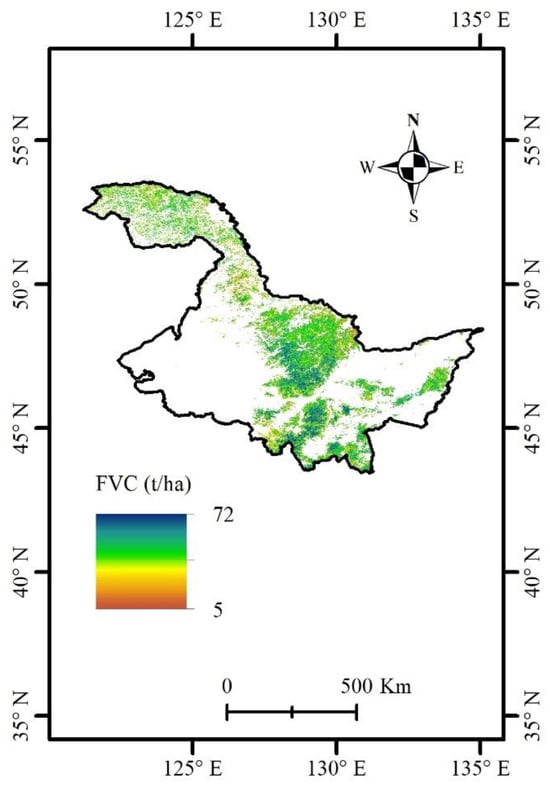 The spatial distribution of the FVC, FSC, and FEC in the Heilongjiang Province in 2015 reveals a gradient from lower values in the north to higher values in the south. This trend can be attributed to three primary factors: (1) Climatic Conditions: The southern part of the Heilongjiang Province experiences relatively warm and humid conditions, which are conducive to forest growth. These conditions foster faster tree growth, higher forest coverage, and greater carbon storage. In contrast, the colder and drier northern region hampers forest development, resulting in lower carbon storage [30]; (2) Vegetation Types: The southern region predominantly features broad-leaved and mixed forests, which generally have higher carbon storage potential. In contrast, the northern region is characterized by coniferous forests, which tend to have lower carbon storage [31]; (3) Soil Conditions: Fertile soils in the southern region support robust plant growth, leading to increased forest carbon storage. Conversely, the poorer soil conditions in the north limit plant growth and carbon storage accumulation [32,33].