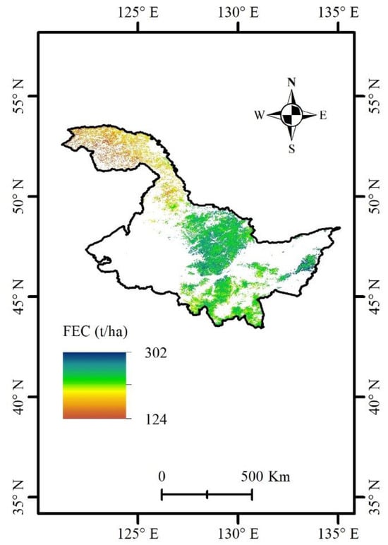 The GWRF model was employed to quantitatively estimate the spatial distribution of the FVC and FSC in the study area for 2015. The results indicated that the FVC in the Heilongjiang Province ranged from 4.91 t/ha to 72.39 t/ha, with an average of 40.88 t/ha, displaying a north-to-south increasing trend (Figure 12). Conversely, the average FSC was approximately 4.5 times greater than the FVC, reaching 182.29 t/ha, with values spanning from 96.01 t/ha to 255.09 t/ha. This variable also exhibited a north-to-south increasing trend, but with a more pronounced gradient (Figure 13). Summing the FVC and FSC on a pixel-by-pixel basis provided the FEC for the study area. The spatial variation of FEC mirrored that of both the FVC and FSC, ranging from a minimum of 124.36 t/ha to a maximum of 302.18 t/ha, with an average value of 223.17 t/ha (Figure 14).