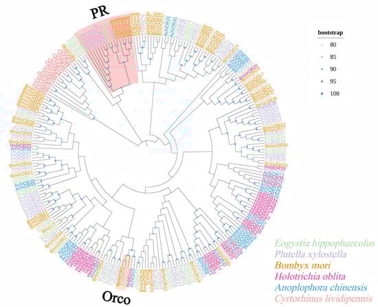 3.1. Phylogenetic Analysis of EhipORs and Other Lepidoptera Odorant Receptors