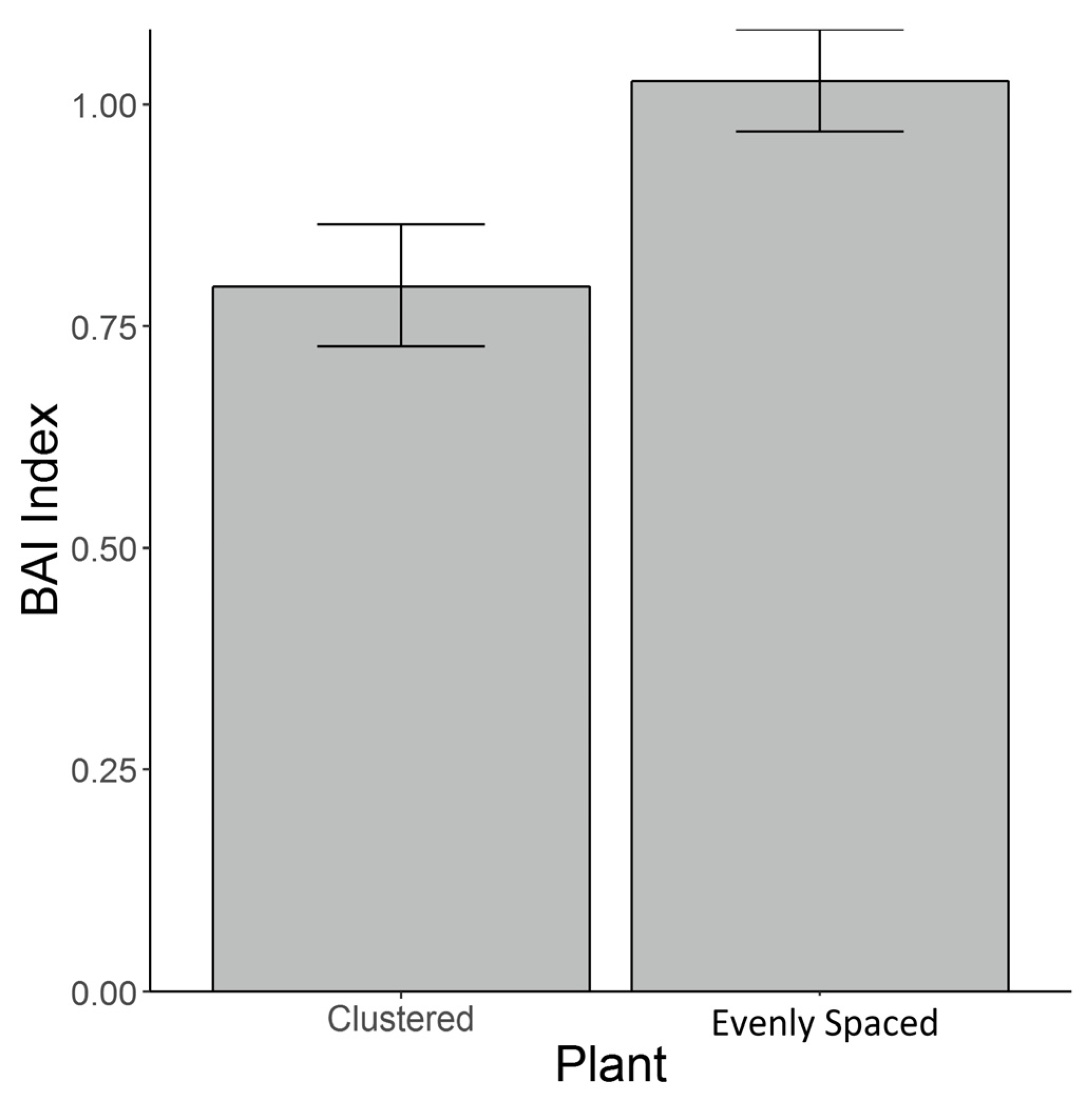 - Evenly spaced plantations appear to maximize growth compared to the clustered arrangement, at least in the short term, which will need to be verified further with future forest monitoring.