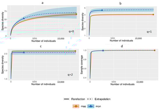 Size-based rarefaction (solid lines) and extrapolation curves (dashed lines) representing species diversity for Hill numbers of order q = 0 (a), q = 1 (b), and q = 2 (c). (d) Plot of sample coverage for rarefied samples (solid line) and extrapolated samples (dashed line) as a function of sample size. mas = mass-trapping traps, mon = monitoring traps.