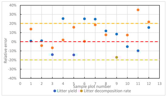 The accuracy of the estimated litter yield and decomposition rates was verified by measuring the surveyed sample plots and calculating the relative error between the estimated and measured values.