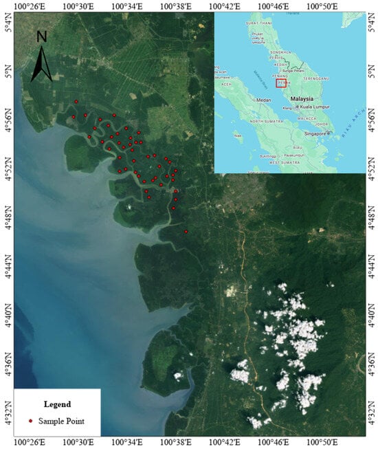 20]. These red-edge and SWIR bands are particularly sensitive to canopy chlorophyll concentration, leaf water status, and other biochemical traits, which are critical for biomass estimation in vegetation studies. Compared with Landsat, Sentinel-2 provides finer spatial (10–20 m) and spectral resolution, enabling more accurate detection of heterogeneous mangrove stands [