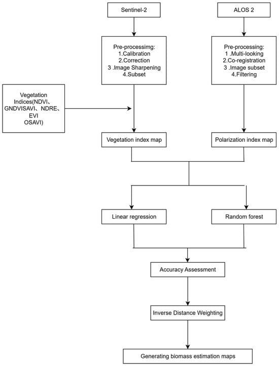 19]. To overcome these shortcomings, our study develops an integrated framework that combines Sentinel-2 multispectral data and ALOS-2 L-band Synthetic Aperture Radar (SAR) backscatter, leveraging their complementary strengths to reduce saturation effects, improve species discrimination, and enhance robustness.