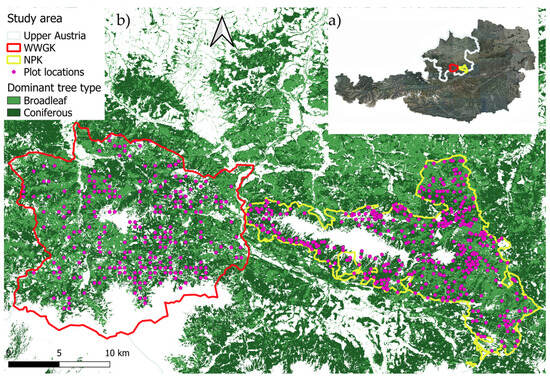 Location of the study areas in Austria (a) with the dominant tree types [15] and plot locations (b).