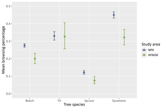 Regarding the reliability of the observed browsing percentages and the magnitude of the confidence intervals, our analysis of the original dataset revealed distinct browsing percentages across the four tree species and the two study areas (Figure 2). In the study area WWGK, sycamore and fir both exhibited the highest browsing probabilities at 33%, with spruce at the lower end at 8%, and beech in the middle at 20%. The NPK study area presented higher browsing rates overall; sycamore reached 45%, fir remained at 33%, beech increased to 27%, and spruce to 12%. The larger sample size in NPK resulted in narrower confidence intervals. Notably, fir consistently showed the broadest confidence intervals across both areas, indicating the smallest sample size on this species.