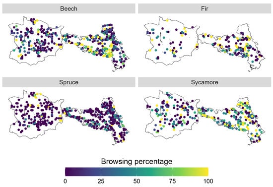 Spatial distribution of browsing percentage per sample plot divided into tree species.