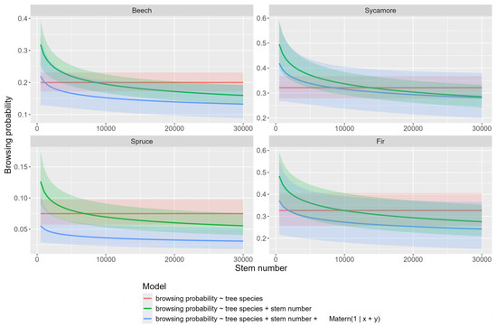 Comparing the prediction of the three models for each study area, we found browsing probabilities for all tree species decreased with increasing stem numbers (Figure 4). For the spatial model predictions, we assumed a randomly located point within the study area. Interestingly, incorporating the spatial random effect into the model results in lower predicted browsing probabilities compared to models that include only tree species and stem number as fixed effects.