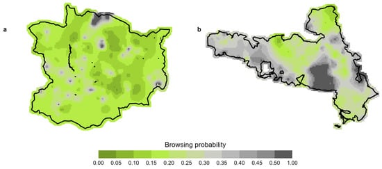 Spatial prediction of browsing probability of beech at medium stem numbers for (a) WWGK (6803 stems per ha) and (b) NPK (9552 stems per ha).