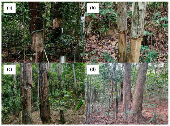 Between the 1960s and 2000, driven by the operational restructuring of forestry enterprises, the forest area of Jianfengling introduced several exotic plantation species into logged natural forest areas or degraded lands. These include A. mangium plantation (AM; planted in 2004), C. lanceolata plantation (CL; planted in 1991), and P. caribaea plantation (PC; planted in 1996). Under comparable elevation, aspect, and slope conditions, this study selected the plantations mentioned above, along with nearby undisturbed or minimally disturbed natural secondary forests, as controls to establish the study plots (Table 1). For each plantation species—A. mangium, C. lanceolata, and P. caribaea—two treatments were applied: (1) Plantation control with no intervention (Natural), and (2) Near-natural restoration via girdling treatment. Natural secondary forest (NSF) plots were established near the plantations as a reference. Three replicate plots of 20 m × 20 m were set up within each stand, spaced at least 20 m apart, where separate vegetation surveys of the tree and shrub layers were conducted. Plantation densities were recorded as 301 trees per hectare for A. mangium (Average height: 17.19 m, average DBH: 28.36 cm), 1108 trees per hectare for P. caribaea (Average height: 14.04 m, average DBH: 16.37 cm), and 2225 trees per hectare for C. lanceolata (Average height: 12.16 m, average DBH: 12.05 cm). The girdling treatment was implemented in July 2022, with all plantation tree trunks undergoing girdling. The procedure involved removing a continuous 35–40 cm wide strip of bark and cambium around the entire circumference of the trunk at a height of 40–100 cm, penetrating approximately 1 cm into the xylem to create a girdling wound (Figure 2). Precautions were taken to avoid damaging naturally regenerating seedlings within the stands during the treatment.
