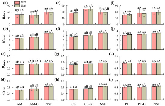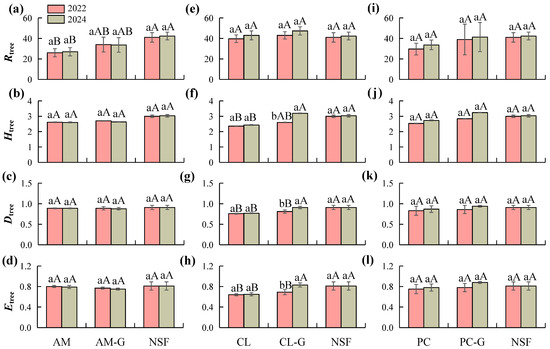 Changes in shrub layer plant diversity indices across different forest types between pre-girdling (2022) and post-girdling (2024). (a–d) Changes in tree layer diversity indices (Patrick index R tree, Shannon-Wiener index H tree, Simpson index D tree, Pielou index E tree,) for AM, AM-G, and NSF between 2022 and 2024. (e–h) Changes in tree layer diversity indices for AM, AM-G, and NSF between 2022 and 2024.for CL, CL-G, and NSF between 2022 and 2024. (i–l) Changes in tree layer diversity indices for PC, PC-G, and NSF between 2022 and 2024. Note: Different lowercase letters indicate significant differences (p < 0.05) between pre-girdling (2022) and post-girdling (2024) within the same forest type, while different uppercase letters represent significant differences (p < 0.05) among different forest types. AM: Acacia mangium plantation, AM-G: Acacia mangium plantation (Girdling), CL: Cunninghamia lanceolata plantation, CL-G: Cunninghamia lanceolata plantation (Girdling), PC: Pinus caribaea plantation, PC-G: Pinus caribaea plantation (Girdling), and NSF: Natural secondary forest.